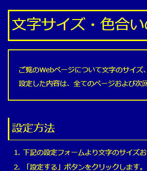 ご覧のWebページについて文字のサイズ、色合いを設定することができます。 設定した内容は、全てのページおよび次回からご利用の際も適用されます。