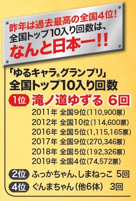 みなさんの熱い応援のおかげで、昨年の「ゆるキャラ(R)グランプリ2019」において、過去最高の全国4位にランクインできました。