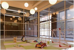 壁面はガラス張りで、ロビーから保護者がプレイルームの様子を見渡せるようになっており、子どもの見守りにも配慮しています。