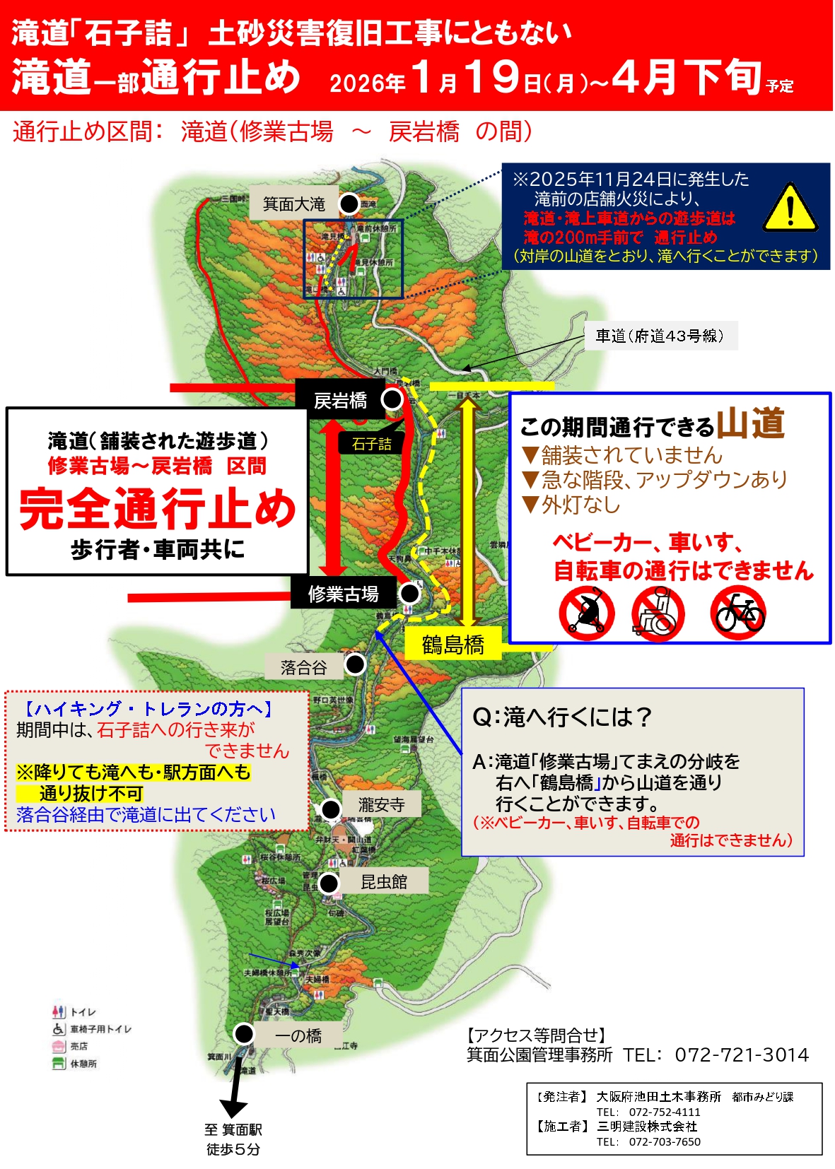 石子詰にて被災した園路下法面土砂崩落復旧工事のため、令和8年1月19日~4月下旬まで修行の古場~戻岩橋区間の滝道が完全通行止めになります。