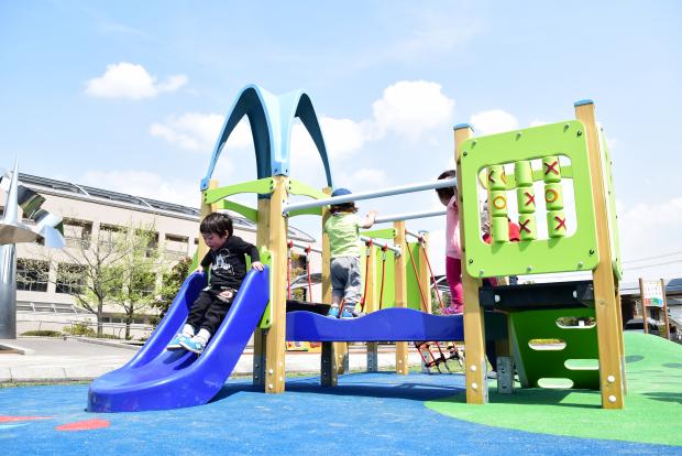 - ゴムチップで地面を舗装していますので、ハイハイやよちよち歩きの乳幼児が元気いっぱい動き回れるとともに、もし転倒してもけがをしにくくなっています。