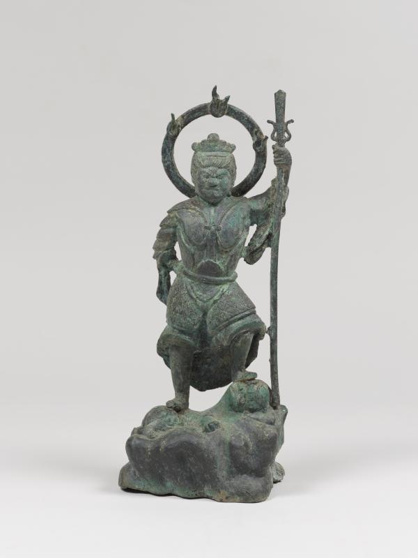 四天王の一尊として南方を守護し仏法を守る。一般的に武将姿で赤色の甲冑と天衣をまとい、手には戟、または剣をもち、憤怒相の姿で表され、足下に邪鬼を踏みつけ、左手に戟(げき)を持ち、右手を腰に当てた姿に表されています。