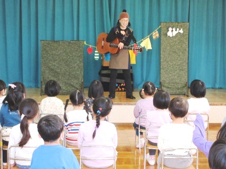 今日から3学期が始まりました。せいなん幼稚園の3学期スタートといえば、ちあきさん!『歌と人形のバスケット』やおちあきさんの人形劇を見ました。ウサギ、カメ、キリン、犬・・・いろいろな動物が登場する楽しいお話でした。子どもたちは、手拍子をして盛り上がりました。ちあきさん、楽しい人形劇をありがとうございました。今年もステキな3学期のスタートとなりました。