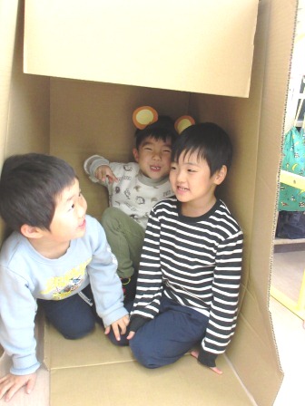年少組では、2月の生活発表会に向けて劇の中で自分が演じたい動物を決めて、その役になりきって遊ぶ姿が見られます。今日は、大きな箱の中にたぬきの役をする子どもたちが「たぬきのお家だよ!」と言って入っていました。するとそこへ違う役の子どもたちも「なになに?楽しそう!入ってもいい?」とやってきて・・・箱のお家は満員になりました。狭いところへみんなで入ることを楽しむ子どもたちでした。少しずつ遊びの中でも劇ごっこの動物になりきって遊んでいる様子が見られます。