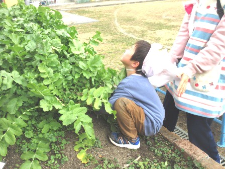 幼稚園の畑で育てていた大根を収穫して、年長児が一人一本家に持って帰りました。お家でおいしく食べてくださいね!
