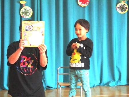 年長組さんから合奏の催しが、先生たちからは、パネルシアターでお祝いの催しがありました。
