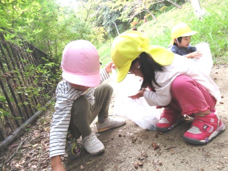 年長組と年少組で手をつないで、大阪大学までお散歩に行きました。広いキャンパスでドングリ拾いをしたり、池の生き物を見たり、秋の自然を感じながら過ごしました。