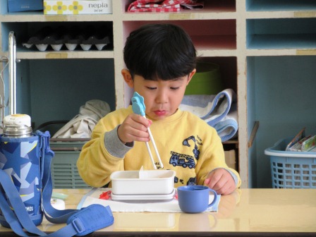 今日から年少組のお弁当が始まりました。朝からお弁当をとっても楽しみにしていた年少さん。お昼になってお弁当を広げると、おいしそうにパクパク食べていました。これからお弁当作り、よろしくお願いします。