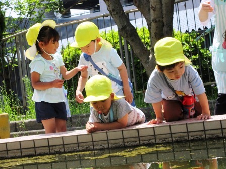 年長組、年少組みんなで中学校までお散歩に行きました。年長組さんが大切に飼育しているカメのせなちゃんのお父さん、お母さんが中学校の池に住んでいます。せなちゃんのお父さん、お母さんを見に行きました。年長組は、まず、校長先生のところへカメの餌をもらいに行きました。校長先生が来客中だったため、ご挨拶だけして、ほかの先生からエサがある場所を聞き、もらいに行きました。みんなでエサをあげたのですが、カメさんたちには残念ながら会えませんでした。今度また、会いに来たいと思います。校長先生、三中の先生、ありがとうございました。 帰りも年長組さんが年少組さんの手を優しくつなぎ、ゆっくり歩いてくれました。頼もしい年長組さんでした!また、お散歩行こうね。