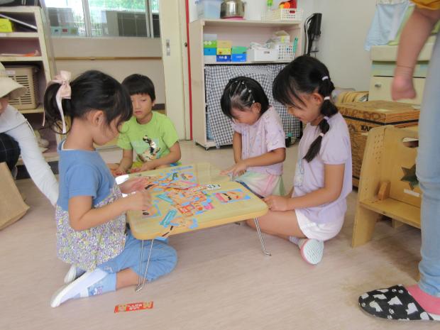 幼稚園で過ごしている子どもたちの様子を保護者に見ていただく、保育参観日でした。お家のかたに日頃子どもたちが楽しんでいる遊びをゆっくりと見ていただきました。参観後、子どもたちに「参観日どんな気持ちがしたかな?」と尋ねると、「お家の人に見てもらえて嬉しかった。」「今度は、一緒に遊びたいな。」「明日も参観日がいいな。」など、いろいろな意見が出ました。保護者の皆さま、熱い中、参観・懇談にご参加いただきありがとうございました。