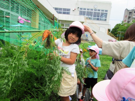 カラスよけのネットをしたり、ロボットを作ったりして今日まで大切に、大切に育ててきたニンジンを収穫しました。明日のカレー会で使うニンジンも同時に収穫しました。年長組は、自分で収穫したニンジンを1本家に持って帰りました。家で食べて感想を聞かせてくださいね!