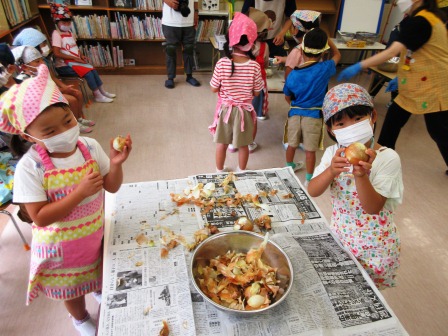 幼稚園で収穫した、ニンジン、タマネギ、ジャガイモを使ってカレーを作りました。年長組の子どもたちが野菜を切って、炒めて、ルーを入れてカレー作りを頑張りました。年少組の子どもたちの分まで調理をしました。自分たちで作ると「タマネギを切ると目が痛くなるね。」や「ニンジンって切るの固いな。」「自分たちで作ったカレーは、言葉がでなくなるほどおいしいね。」など、いろいろな気付きがありました。たくさんおかわりをして、おなかいっぱい食べました!
