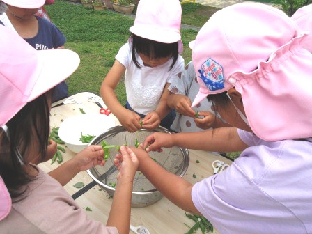 エンドウ豆の収穫をしました。はさみで1つ1つ丁寧に切り離し、中味を出しました。豆の中味を見て「たくさん入っているね。」「6人家族やな。」「こっちは、小さい豆も入ってた。」など、たくさんのつぶやきが聞こえてきました。豆は、塩ゆでにしてお弁当の時に食べました。おいしかったね!