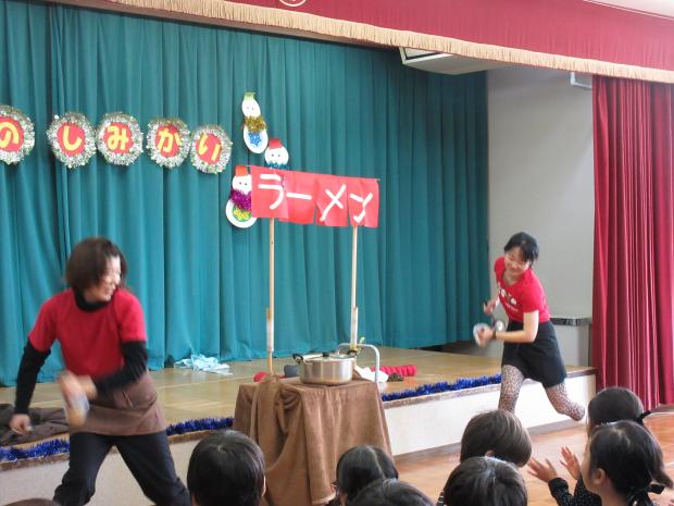 PTAの皆さんと幼稚園が一緒に企画した「冬のお楽しみ会」を行いました。今年は、Angel Voices Gospel Choir(エンジェル ボイシーズ ゴスペル クワィヤー)さんに来ていただき、とってもかっこいいゴスペルを聴かせていただきました。子どもたちも一緒に歌ったり、友達のお父さんが歌うのを聞いたりして、とても盛り上がりました。その後は先生達からの催しとして「よさこいラーメン」の踊りを見てもらいました。役になりきっている先生達、面白くて、多くの笑い声が聞かれました。最後には、PTAさんから一人ひとりにプレゼントをもらい、とても嬉しそうな子どもたちでした。満足した時間になったのですが、実はまだ終わりではなく、各保育室にもクラス用のプレゼントが隠されていました。発見した子どもたちはまたまた大興奮!とても楽しい時間となった冬のお楽しみ会でした。