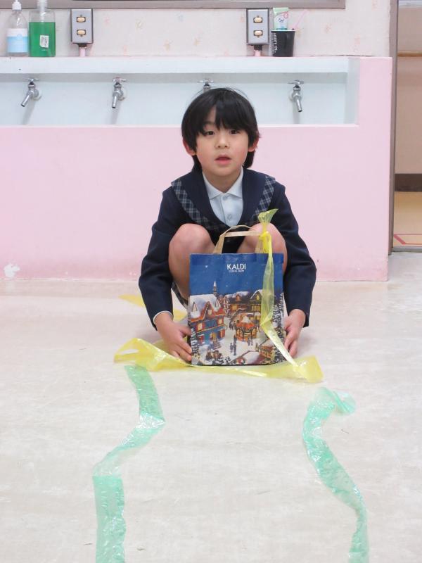 新年が始まり、「福をひこう!」ということで福引き大会を行いました。なにが入っているのかはわからないのですが、どのひもにしようか一生懸命に悩み、ひもを選んでいました。ひもにつながった袋の中を見るのは、お家に帰ってからという約束なので、みんなとても大切そうに抱えていました。どんなプレゼントが入っていたのでしょうね。