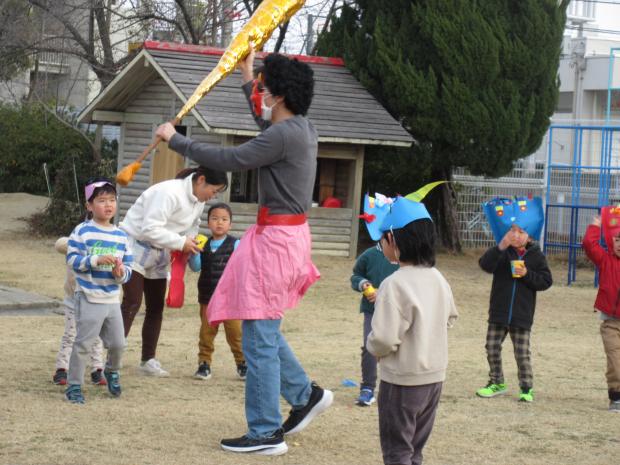 みんなで鬼のお面を見せ合っていると、突然鬼がやってきました。赤鬼と青鬼の登場に子どもたちはみんなびっくりして、あわててマスを捕りに行き、「おにはそと~」と豆をまいていました。