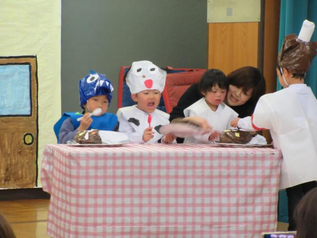 みんなでストーリーを考えたり、大道具や小道具を作ったり、背景を描いたりしながら作り上げてきた劇。自分の担当する楽器を一生懸命練習して、みんなで合わせた合奏。気持ちを一つにして歌った歌。お役さんの前で披露することで緊張していた子どもたちでしたが、拍手をもらったり、笑ってもらったりすることで、少しずつ緊張もほぐれ、楽しそうに披露していました。年長、年少ともに、それぞれのクラスカラーがよく出た内容だったと思います。後日、お家の人にもたくさん褒めてもらったことを教えてくれた子どもたち。表現すること、クラスのみんなと作り上げることの楽しさを感じてくれたのではないかと思います。