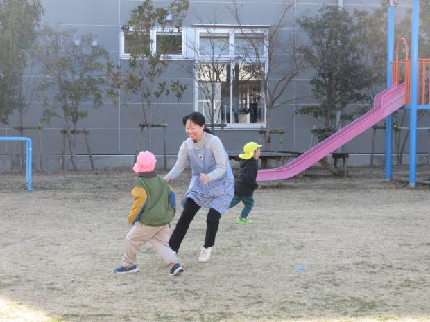 話を聞いた後は、みんなで鬼ごっこをしました。鬼役の先生達から一生懸命逃げていた子どもたち。みんなとても楽しそうでした。
