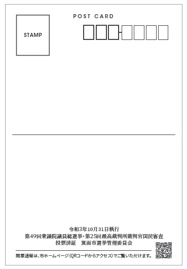 箕面市選挙管理委員会では、10月31日(日曜日)に執行される、第49回衆議院議員総選挙及び第25回最高裁判所裁判官国民審査で、ポストカードとしても使用できる投票済証を配布します。