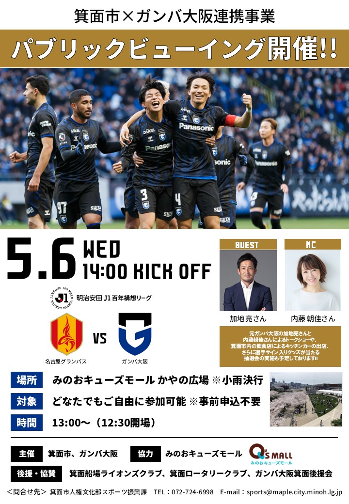 豊田スタジアムにて行われる名古屋グランパス戦を、ガンバ大阪OB加地亮さんと元スタジアムMC内藤朝佳さんによる試合解説を聞きながらのパブリックビューイングです。