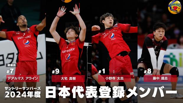 サントリーサンバーズより小野寺太志選手(ミドルブロッカー・28歳)、デアルマス アライン選手(アウトサイドヒッター・23歳)、藤中颯志選手(リベロ・24歳)、大宅真樹選手(セッター・28歳)の4名が選出されました。