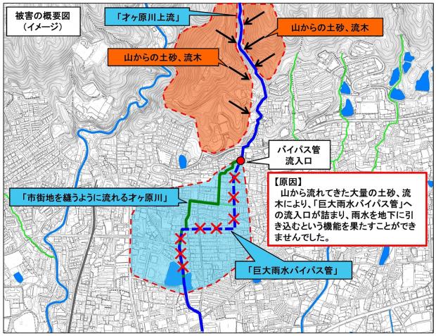 山から流れてくる「才ヶ原川源流」の水を「巨大雨水バイパス管」に流し入れることができれば、昨年のような大きな浸水被害は防ぐことができると思われます。