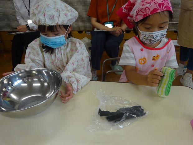 「削った石けんに水を入れて、クリームを作ろう!」「水をどのくらい入れようかな?」