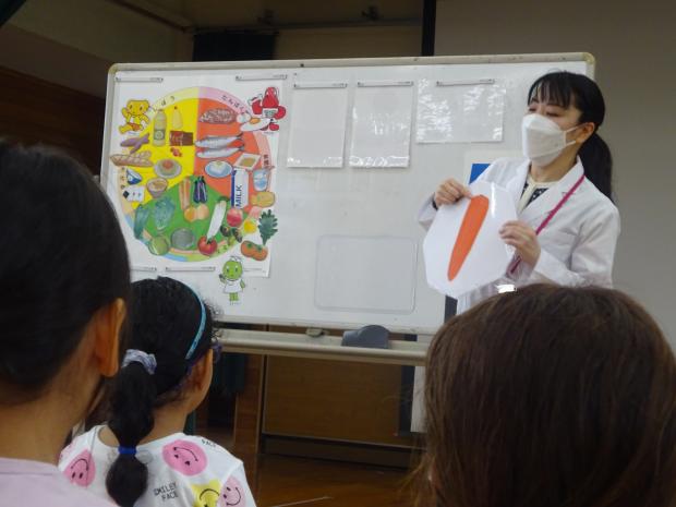 食べ物は、赤・黄・緑の3つの仲間に分けられること、どの食べ物がどの色の仲間になるかなどを、分かりやすく教えてくれました。お肉や魚は筋肉や骨を作る「赤のグループ」、ご飯やパンなどはエネルギーの元となる「黄のグループ」、ニンジンやトマト、リンゴなどは体の調子を整える「緑のグループ」・・・と、食べ物をひとつずつどのグループになるのかみんなで一緒に考えました。