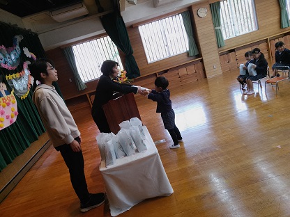 今日は年少さんの修了式を行いました。進級のお祝い品を一人ずつ受け取り、笑顔いっぱいの子どもたちです。4月から、あこがれの年長さんになることへの期待がいっぱい膨らみました。
