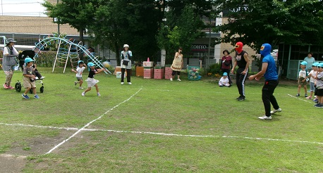 年長さんは数日前にマッスルカップドッジボールチャレンジがあったので、「年長さん 対 マッスルマン」でドッジボール対決をしました。マッスルマンはとても強く、年長さんは負けてしましましたが、マッスルマンと勝負できた嬉しさや楽しさ、負けた悔しさなどいろいろな気持ちを感じることができました。