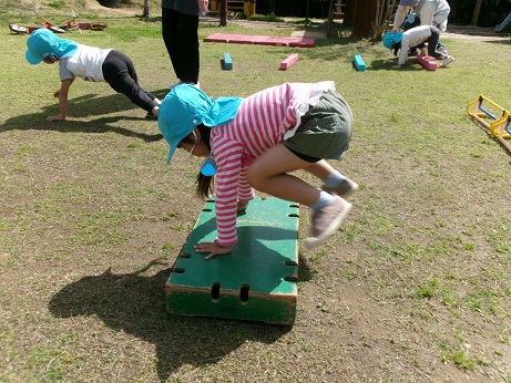 朝の体操の後、毎日、身体を動かす時間(チャレンジタイム)を行います。今月は、いろいろな体育遊具を使って、身体のバランスを取る力や腕の支持力がつくことを意識して取り組んでいます。