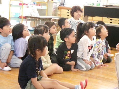 豊川南小学校のお話会のかたが、月2回、幼稚園の子どもたちに絵本や紙芝居を読みにきてくれます。子どもたちにとって、ほっこりととても楽しい絵本の時間です。真剣に聞く表情や声を出して笑う姿などが見られました。